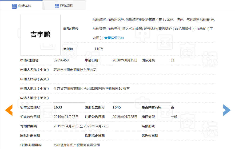高频感应加热设备品牌JYP和吉宇鹏在商标局查询加热装置; 加热用锅炉; 供暖装置用锅炉管道(管); 固体、液体、气体燃料加热器; 电加热装置; 加热元件; 浸入式加热器; 燃气锅...