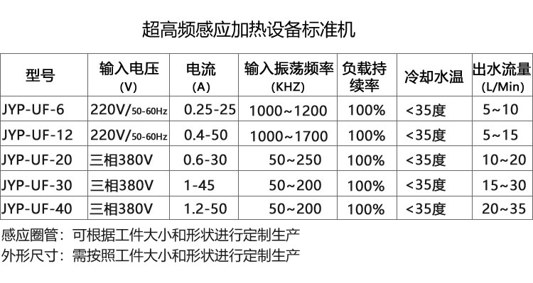 特殊功能 | 如双频设备、多负载匹配型(双机头、多抽头)、自动控制型、一拖二、桥梁输油管弯管、恒功率恒电流、软连接感应器。 | ||